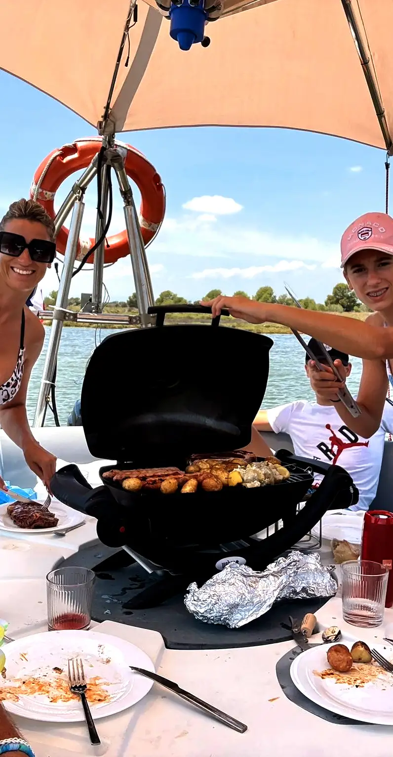 Autour d’un grill, les convives savourent l’instant, assis confortablement sous un parasol, glacière à portée de main, musique en fond, en toute liberté. Pas besoin de penser au menu : grillades et boissons sont incluses dans nos formules.Le bateau est sans permis et silencieux… Pour une escapade en toute liberté, sans stress ni bruit au plus proche de la nature.